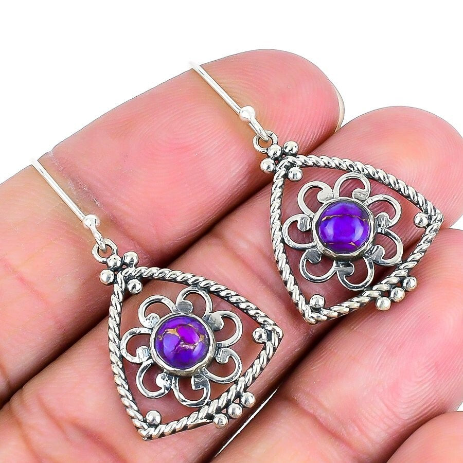 Copper Purple Turquoise Gemstone Dangle Bezel Earrings Jewelry Sterling Silver