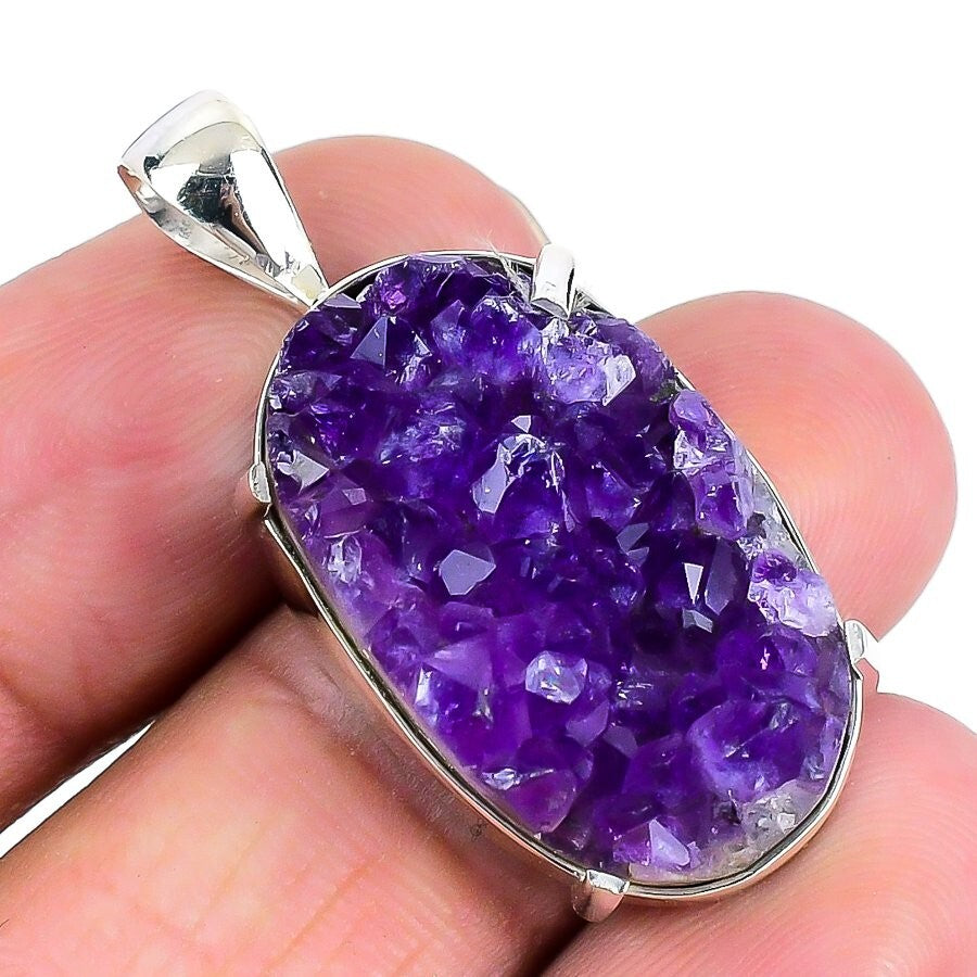 Amethyst Druzy Stone 925 Sterling Silver Bezel Wedding Birthday Ethnic Pendant
