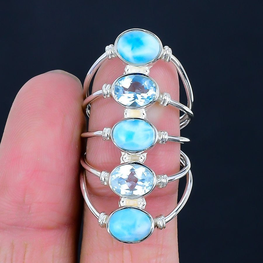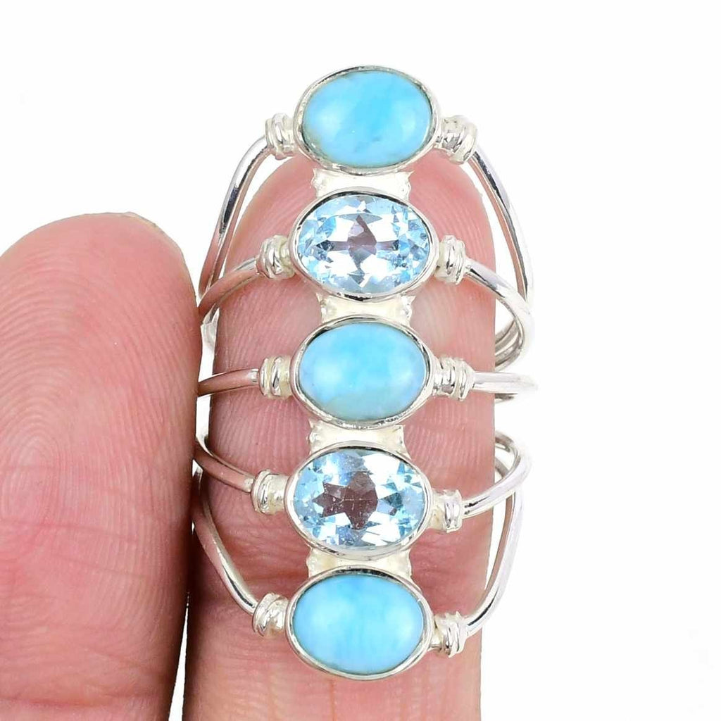 Larimar & blue topaz Gemstone Solid Silver Wedding Artisan Cluster Ring Size 8.5