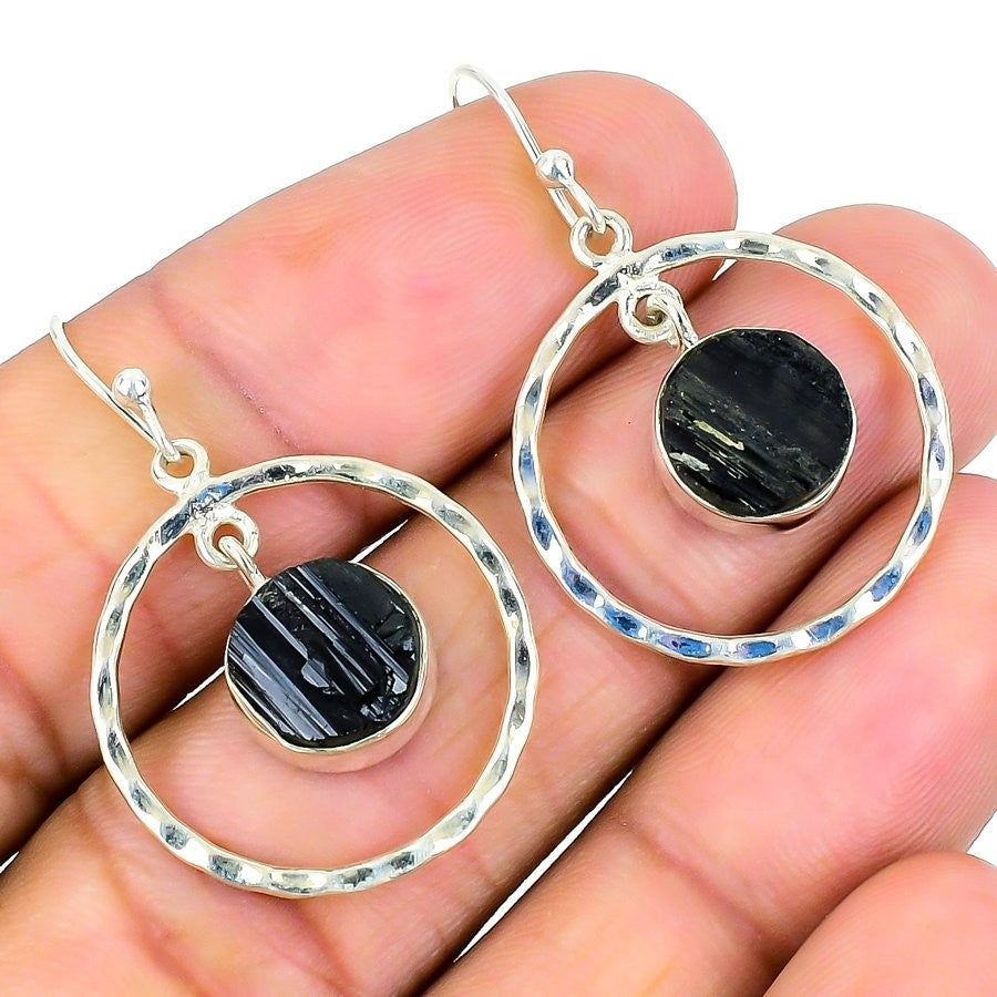 Natural Black Tourmaline Hook Dangle Drop Birthday Earrings 925 Sterling Silver
