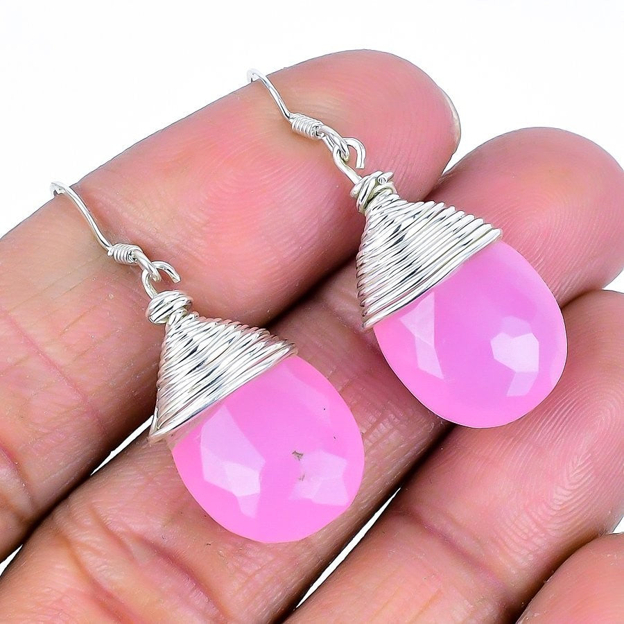 Natural Pink Chalcedony Handcrafted Birthday Dangle Earrings 925Ā SolidĀ Silver