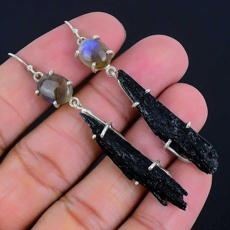 Black Kyanite Gemstone 925Ā SolidĀ Silver Hook Bezel Drop Dangle Earrings Jewelry