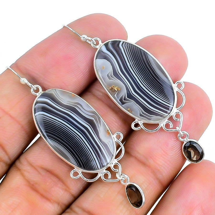 Banded Agate Stone Solid Sterling Silver Mother Dangle Drop Hook Ethnic Earrings
