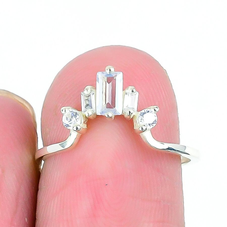 Natural Rainbow Moonstone Faceted 925Ā SolidĀ Silver Ethnic Cluster Ring Size 7.5