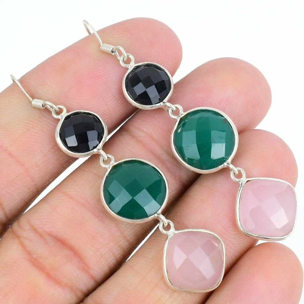 Natural Green onyx Rosequartz 925 Silver Hook Boho Wedding Drop Unique Earrings