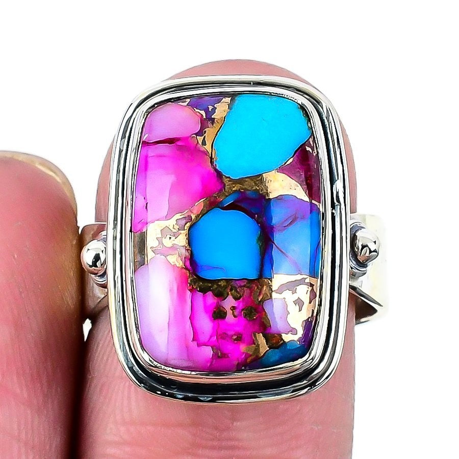 Pink Spiny Oyster Gemstone 925Ā SolidĀ Silver Cluster Trendy Art Deco Ring Size 8
