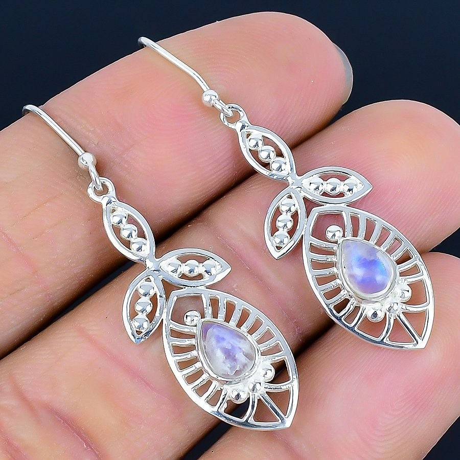 Rainbow Moonstone Gemstone Solid Sterling Silver Drop Crown Chakra Hook Earrings
