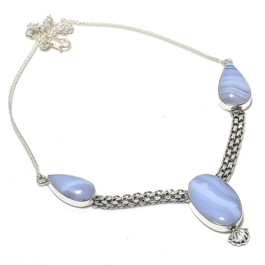 Natural Blue Lace Agate Sterling Silver Hook Chain Art Deco Anniversary Necklace