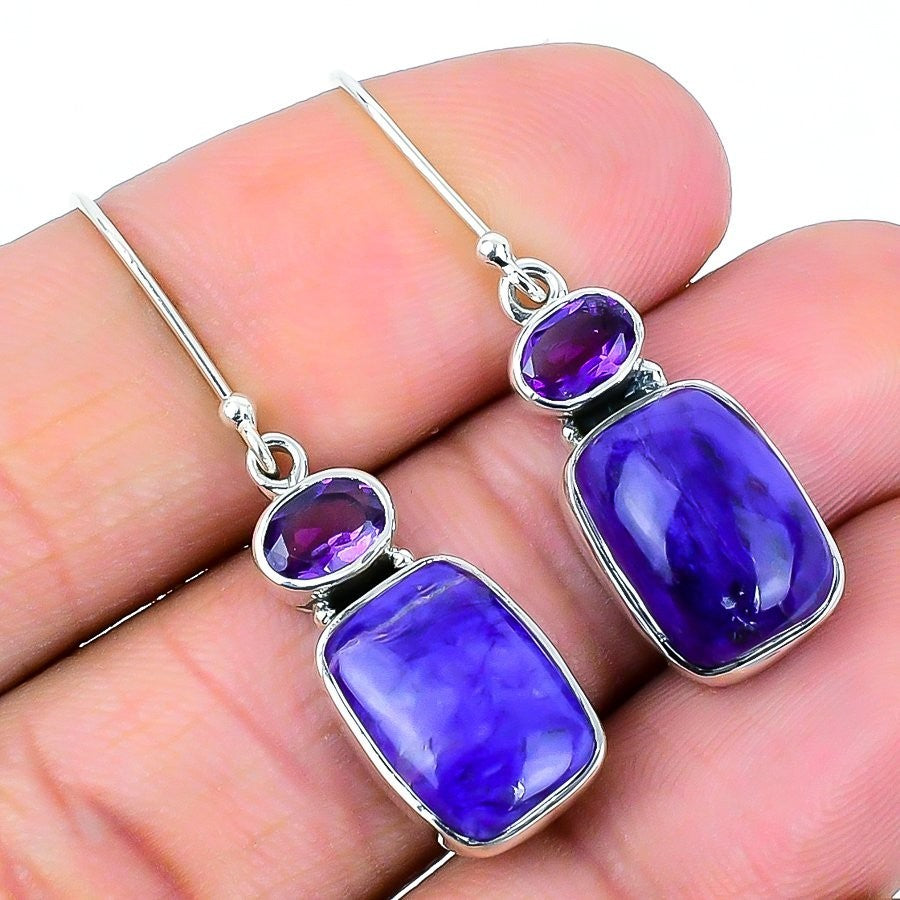 Natural Russian Charoite Hook New Dangling Sister Earrings 925 Sterling Silver