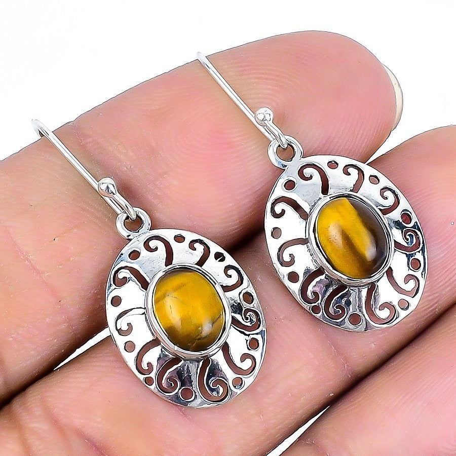 Tiger Eye Stone Hook Wife Dangling Handmade Art Deco Earrings Jewelry 925 Silver