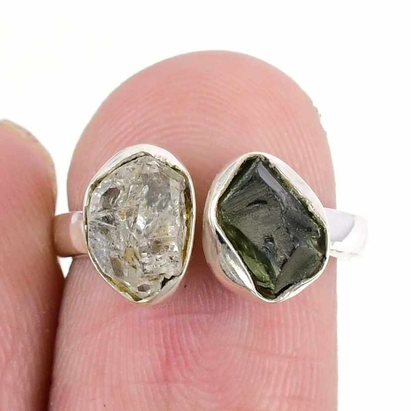 Moldavite & herkimer Diamond Gemstone Cluster New Ring Jewelry Size 7 925 Silver