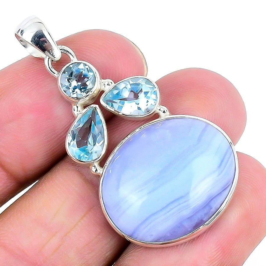 Third Eye Chakra Blue Lace Agate Stone 925 Sterling Silver Boho Pendant Jewelry
