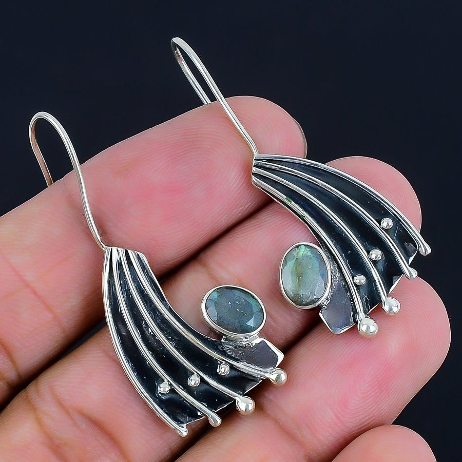 Labradorite Gemstone Solid Silver Dangle Drop Daughter Gift Hook Bezel Earrings