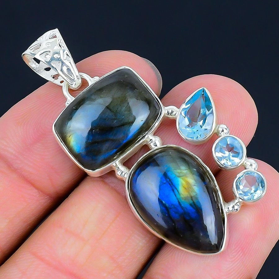 Natural Labradorite Solid Silver Engagement Bezel Unique Trendy Pendant Jewelry