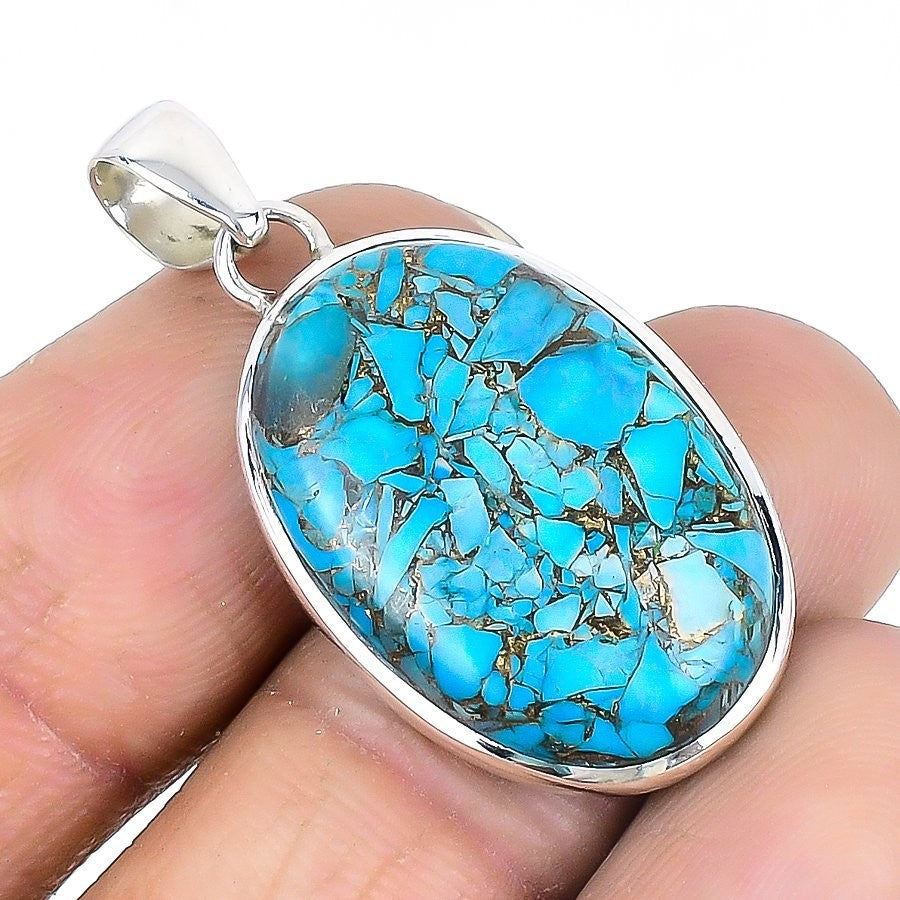 Natural Copper Blue Turquoise Solid Sterling Silver Daughters Day Wife Pendant