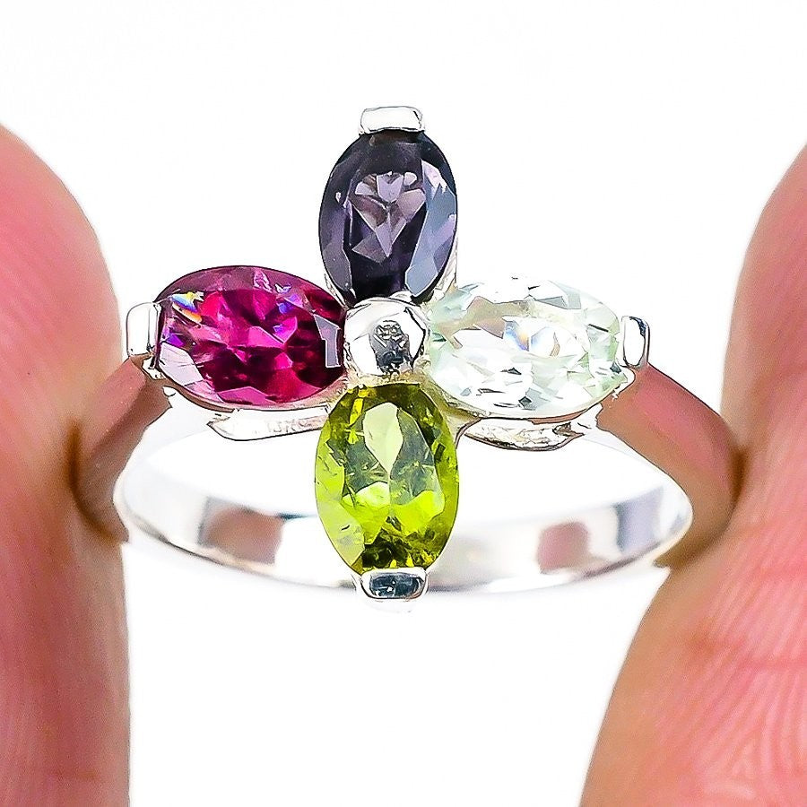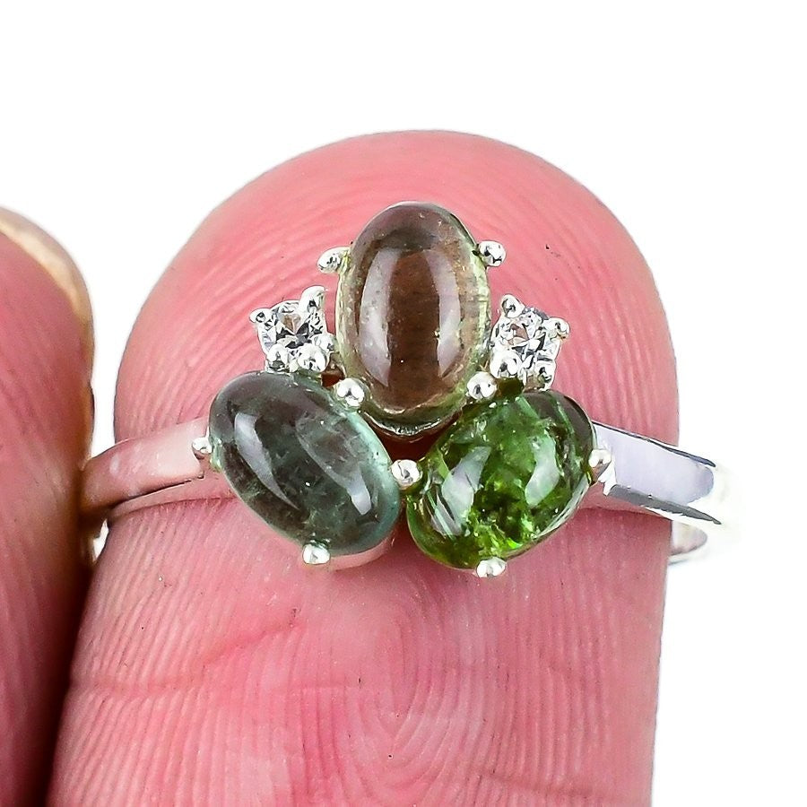 Green Tourmaline Gemstone Cluster Wife Ring Jewelry Size 7 Solid Sterling Silver
