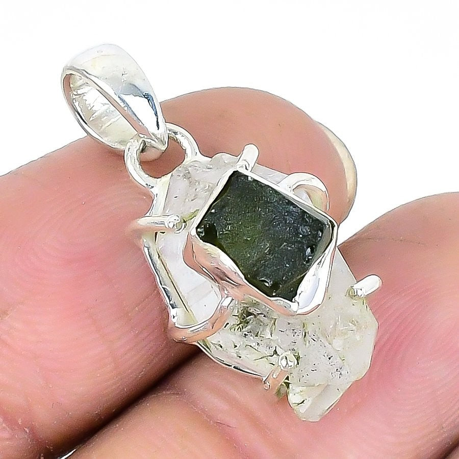 Daughters Day Sale Moldavite Quartz Stone 925Ā SolidĀ Silver Boho Pendant Jewelry
