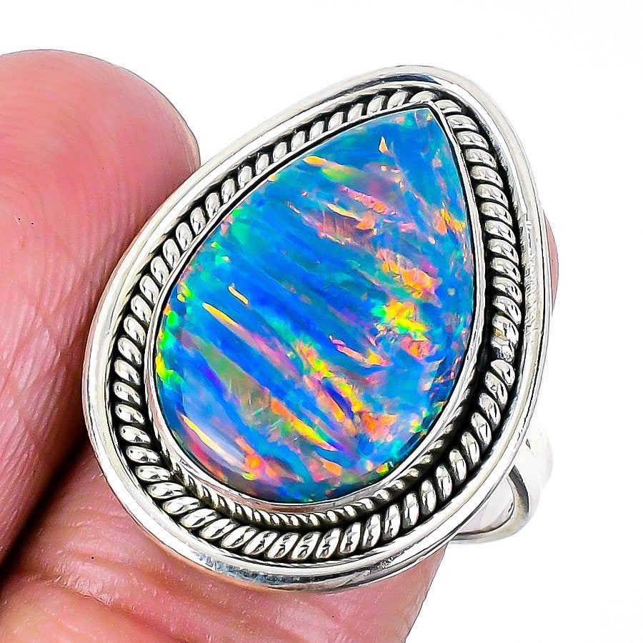 Aurora Opal Gemstone Sterling Silver Mother Wedding Trendy Statement Ring Size 9