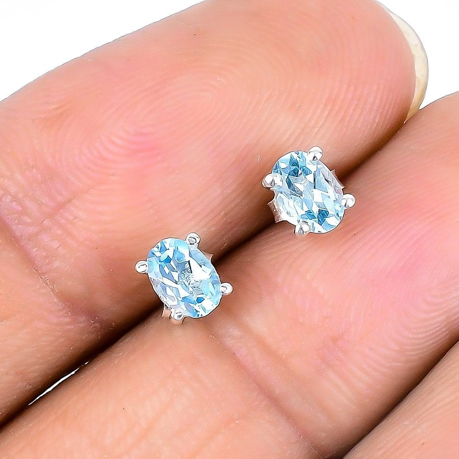 Aqua Topaz Stone Solid Sterling Silver New Stud November Birth Handmade Earrings