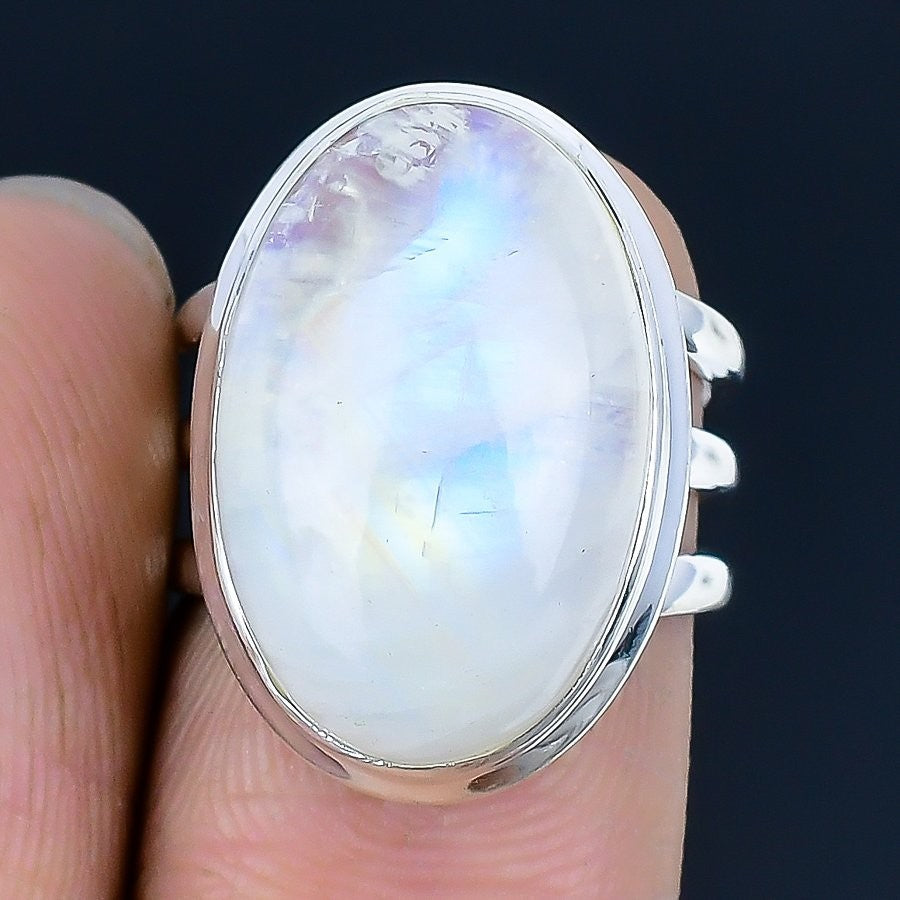 Natural Rainbow Moonstone Solid Sterling Silver Mother Statement Boho Ring US 6