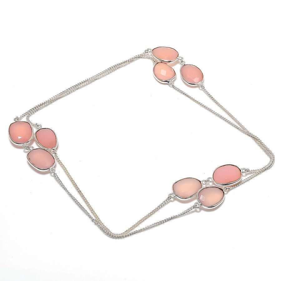 Pink Chalcedony Gemstone Solid Sterling Silver Sister Hook Trendy Chain Necklace