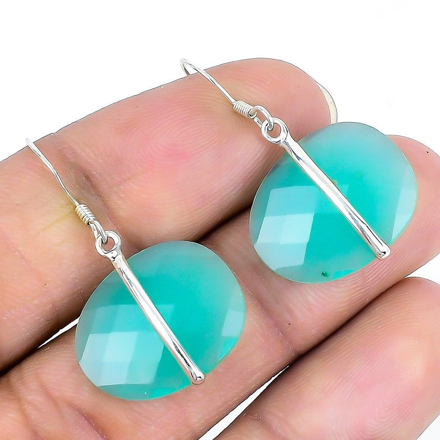 Green Chalcedony Faceted Gemstone Solid Sterling Silver Dangle Drop New Earrings