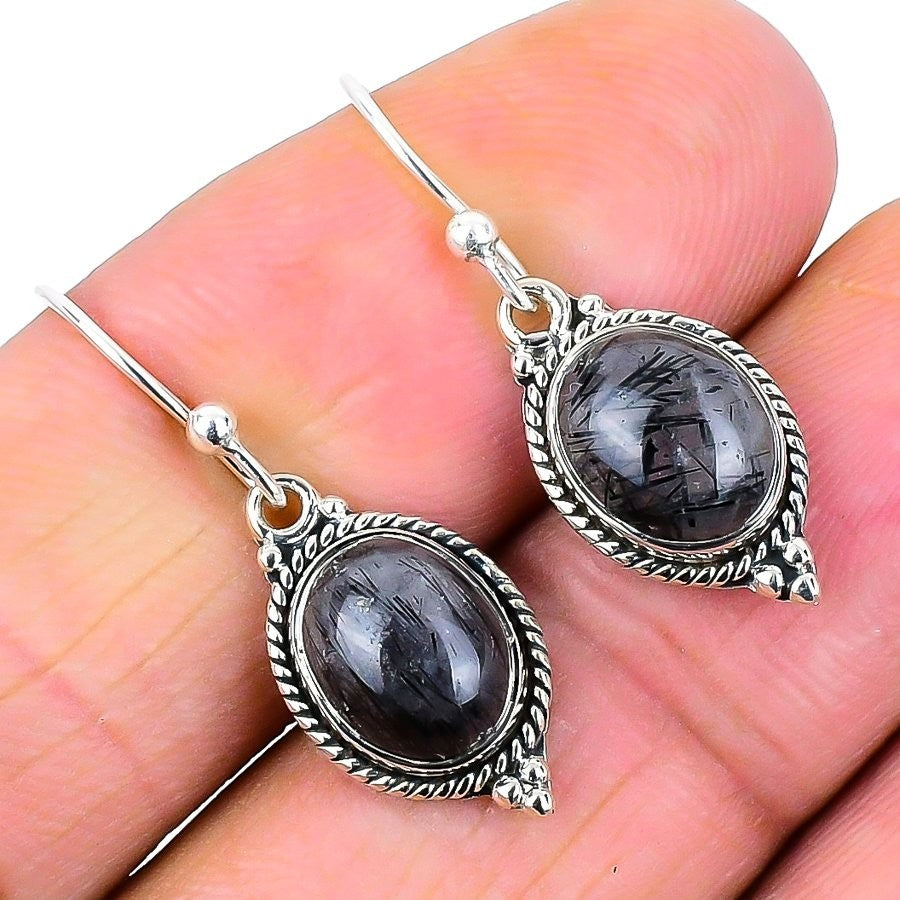 Natural Black Rutile 925 Sterling Silver Handmade Mother Dangle Hook Earrings
