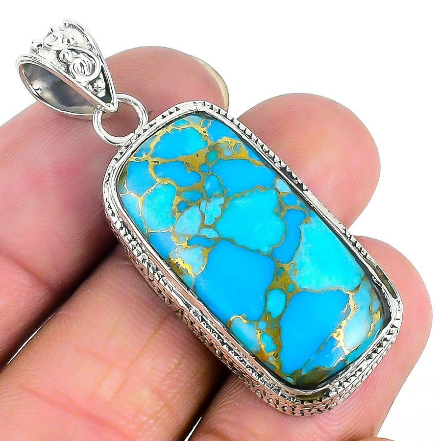 Natural Copper Blue Turquoise Daughter Gift Bezel Wife Pendant 925Ā SolidĀ Silver