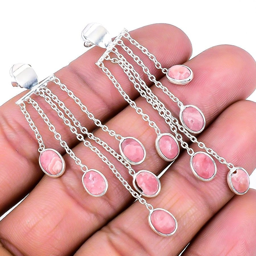 Rhodochrosite Stone Unique Dangling Heart Chakra Earrings 925 Sterling Silver