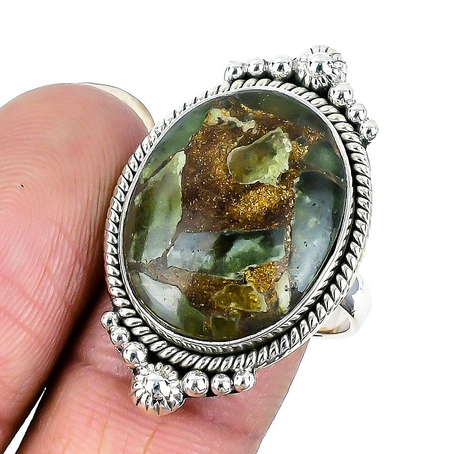 Copper Serpentine Gemstone 925Ā SolidĀ Silver Mother Statement Boho Ring Size 9.5