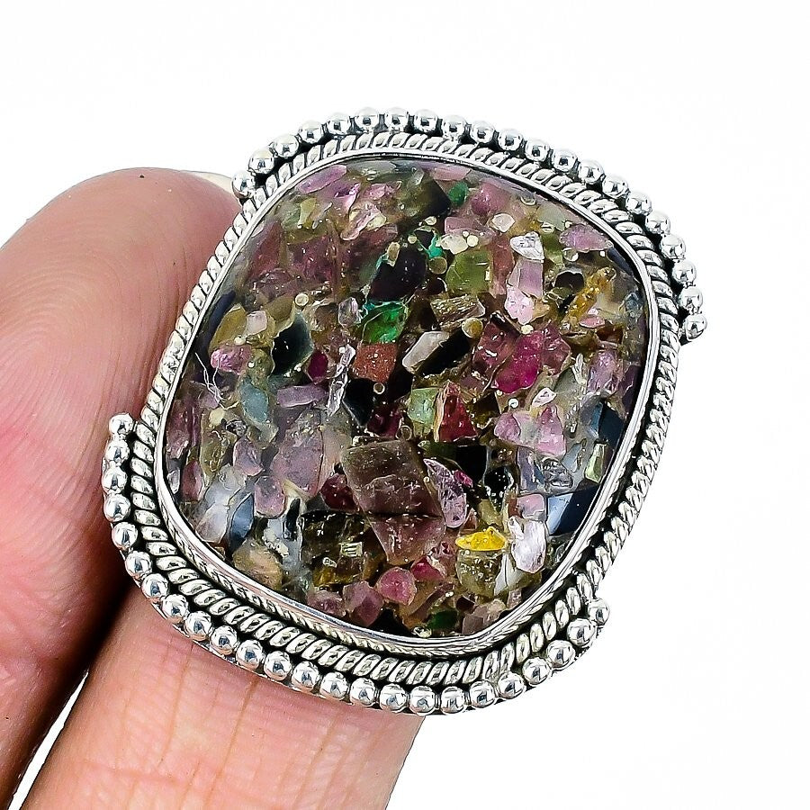 Watermelon Tourmaline Composite Gemstone Trendy Statement Sister Ring 925 Silver