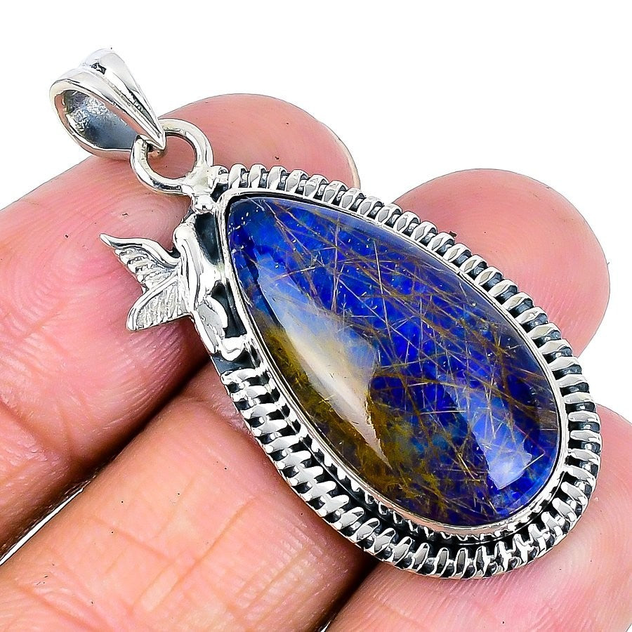 Golden Rutile Lapis Backed Stone Solid Sterling Silver Artisan Pendant Jewelry