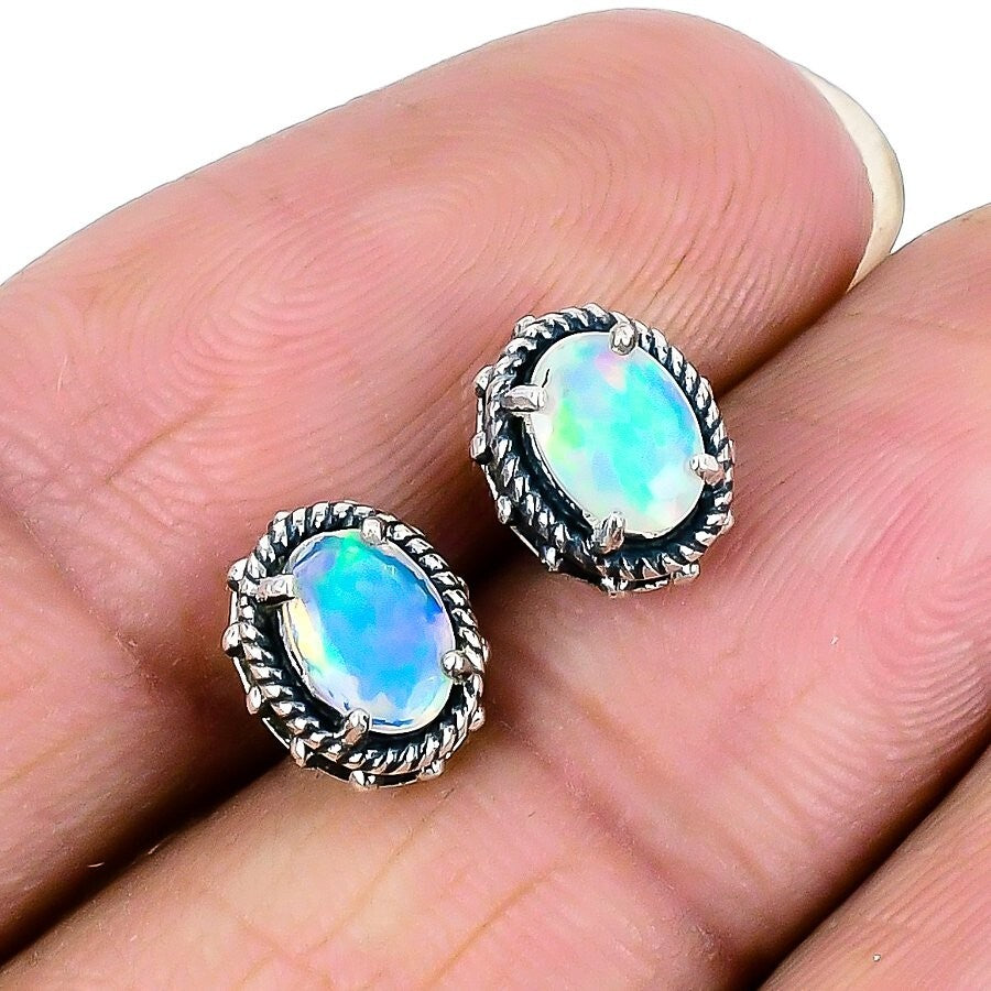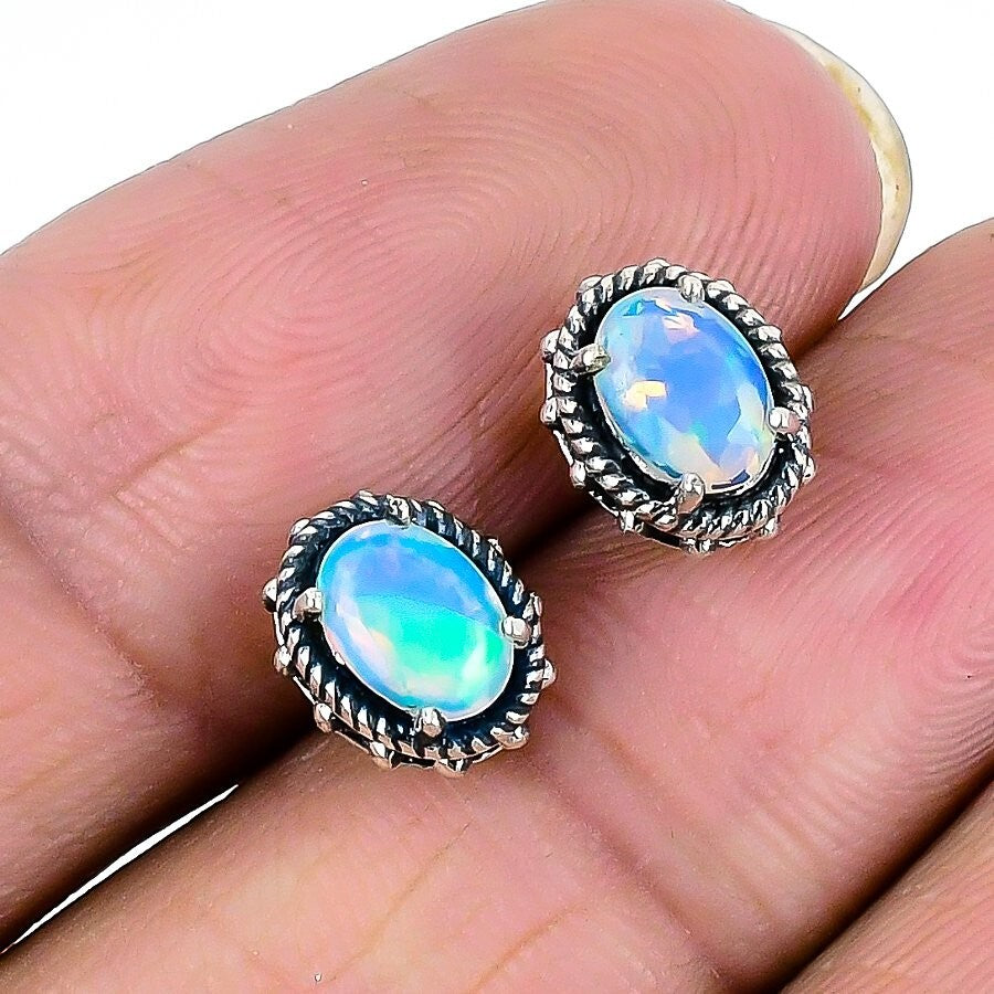 Natural Ethiopian Opal Faceted Stud Post Earrings Jewelry Solid Sterling Silver