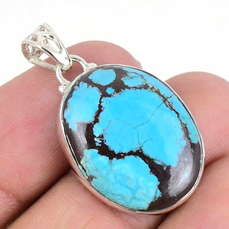 Throat Chakra Natural Tibetan Turquoise Sterling Silver Art Deco Pendant Jewelry