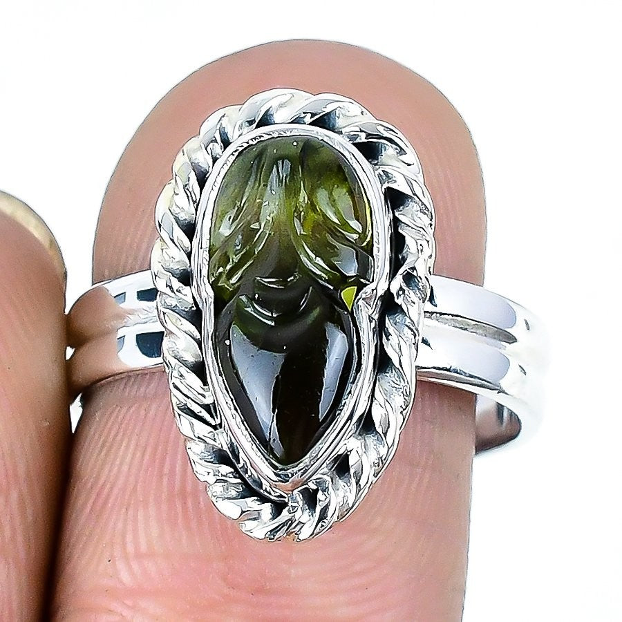 Green Tourmaline Carving Stone Solid Sterling Silver Sister Statement Ring US 9