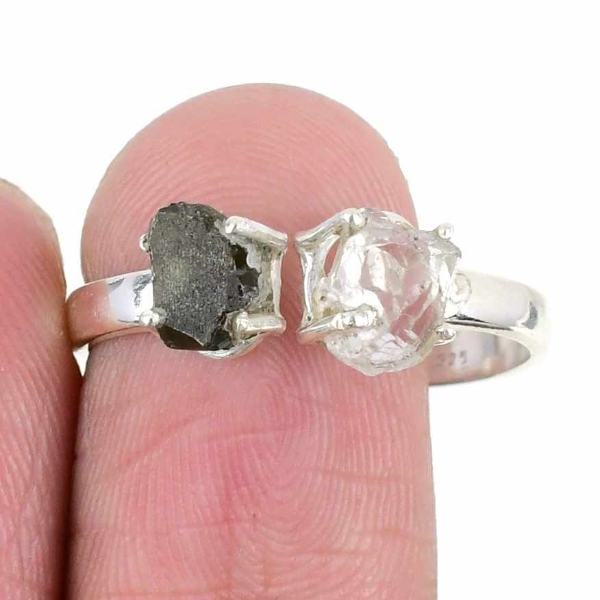 Moldavite & Herkimer Gemstone Boho Cluster Ring Jewelry Size 11 Sterling Silver
