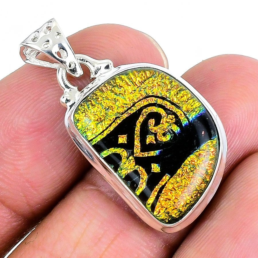 Natural Mexican Dico Glass Sterling Silver Art Deco Ethnic Bezel Pendant Jewelry