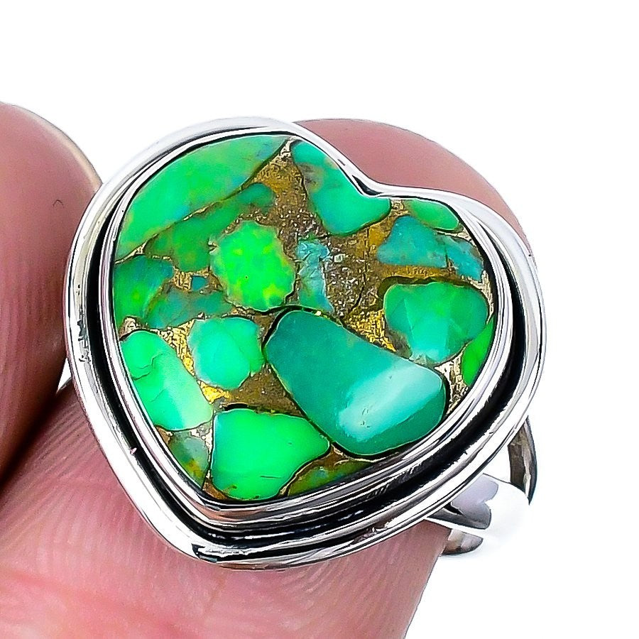 Copper Green Turquoise Heart Stone Sterling Silver Elegant Statement Ring US 7
