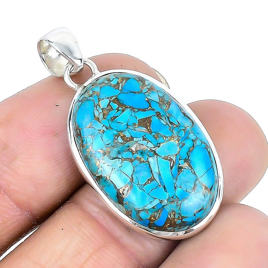 Copper Blue Turquoise Stone Solid Silver Engagement Throat Chakra Sister Pendant
