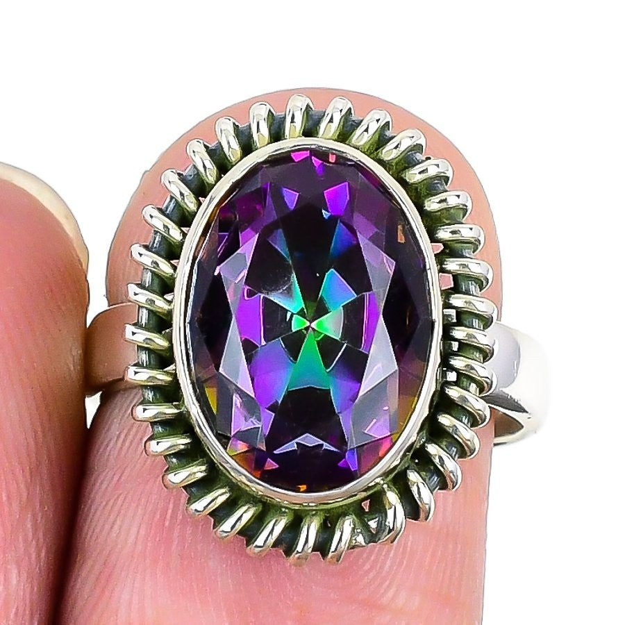 Natural Mystic Topaz 925 Silver Wedding Statement Engagement Bezel Ring Size 7