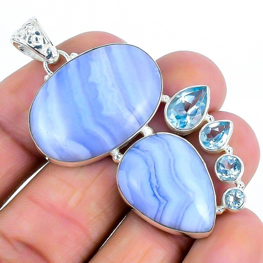 Blue Lace Agate Stone 925Ā SolidĀ Silver Mother Elegant Wedding Pendant Jewelry