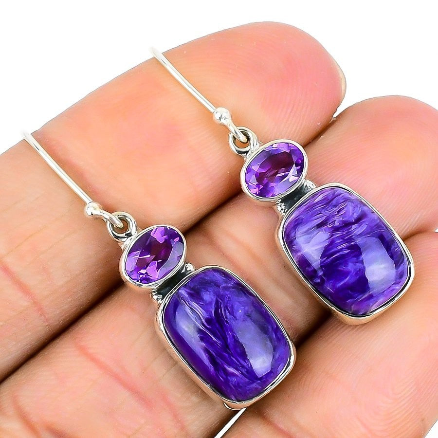 Natural Russian Charoite Artisan Hook Dangle Drop Handmade Earrings 925 Silver