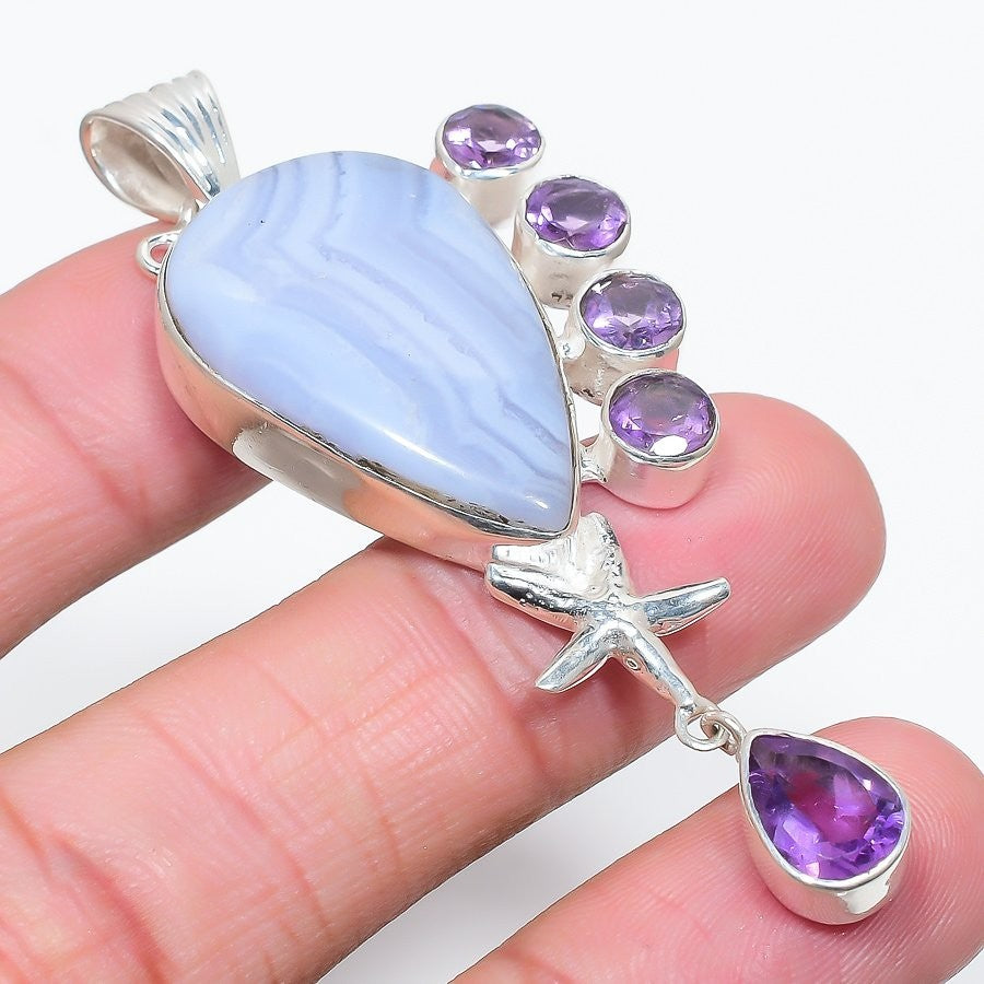 Third Eye Chakra Natural Blue Lace Agate Pendant Jewelry Solid Sterling Silver