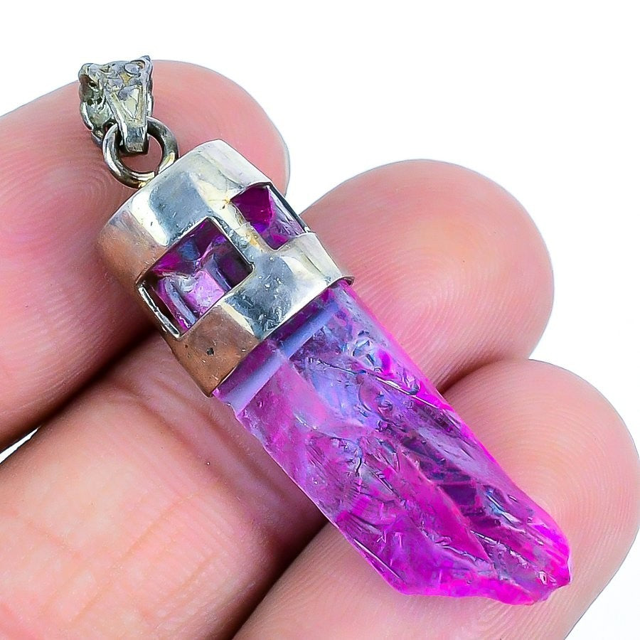 Natural Pink Aura Crystal 925 Sterling Silver Daughter Art Deco Wedding Pendant