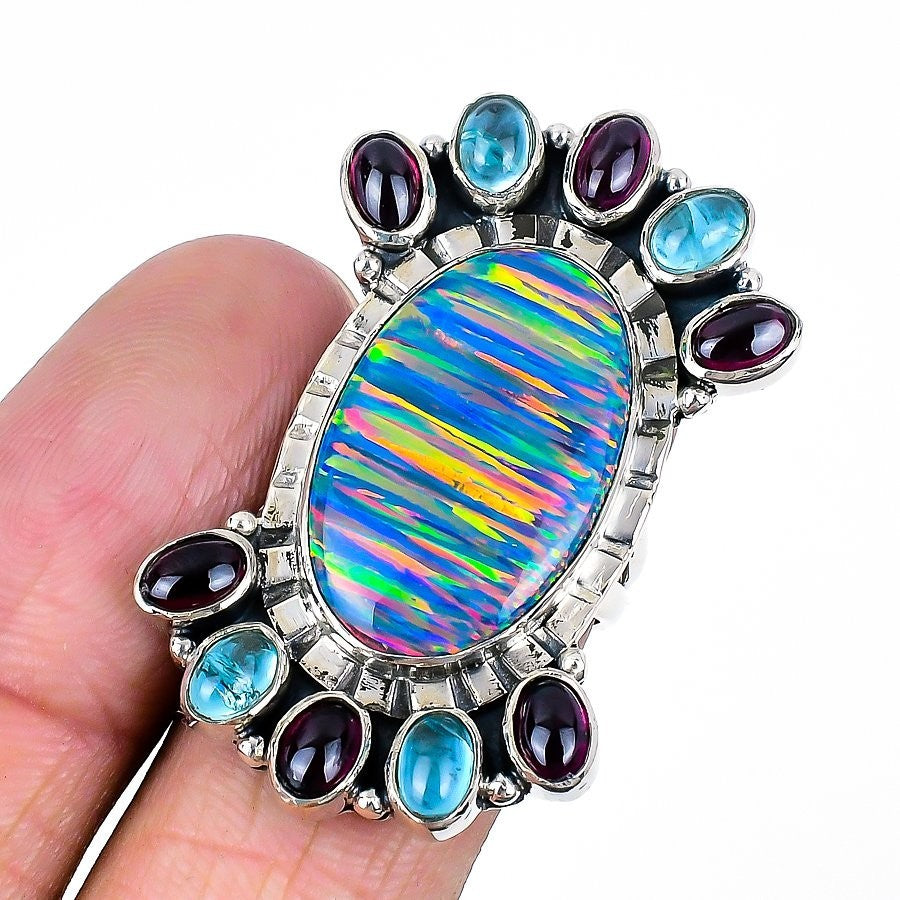 Aurora Opal Stone 925 Silver Trendy Mother Statement Artisan Ring Jewelry US 7