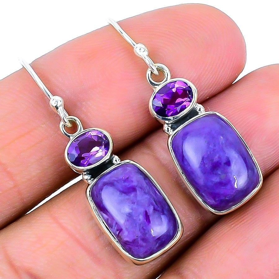 Russian Charoite Stone Wedding Dangle New Earrings Jewelry 925 Sterling Silver