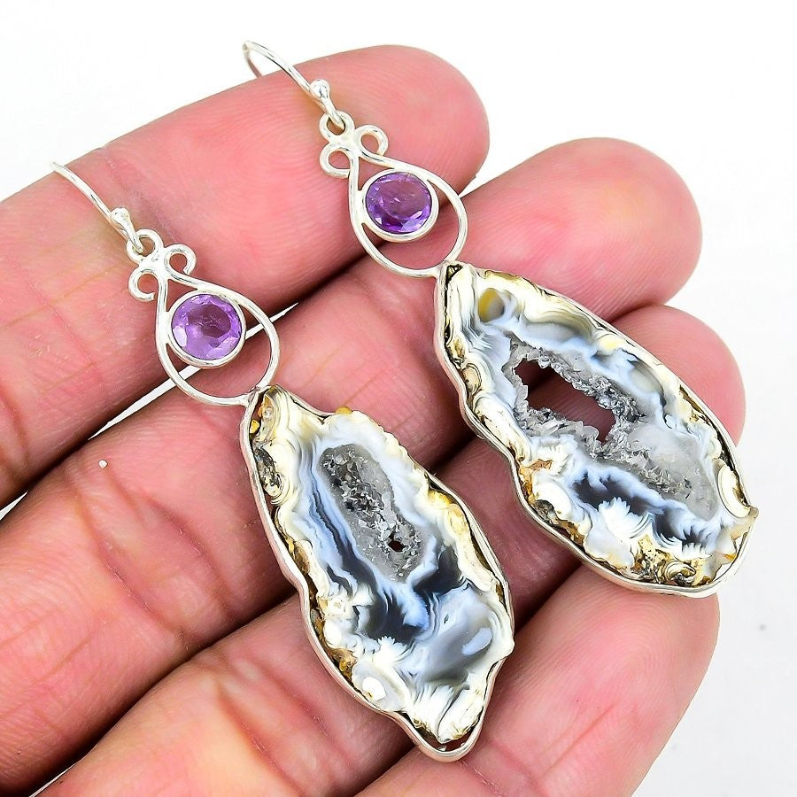 Geode Druzy Gemstone 925 Silver Dangling Hook Engagement Mother Earrings Jewelry