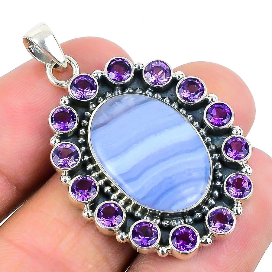 Natural Blue Lace Agate Solid Silver Third Eye Chakra Engagement Artisan Pendant