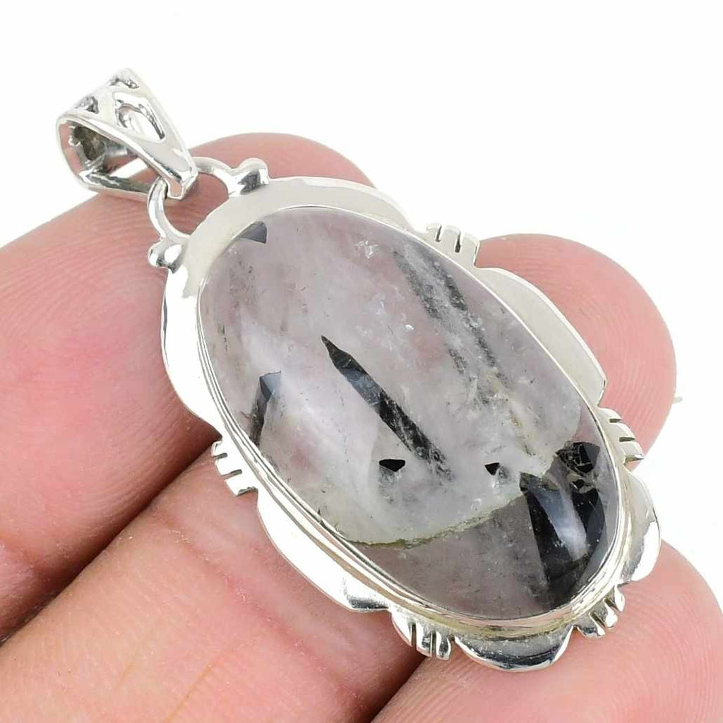 Daughters Day Sale Black Rutile Stone Solid Sterling Silver Birthday New Pendant