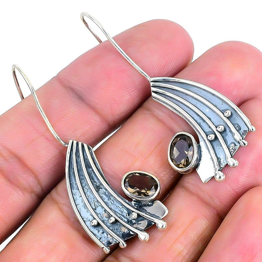 Natural Smoky Topaz Daughters Day Hook Dangle Handmade Earrings 925Ā SolidĀ Silver